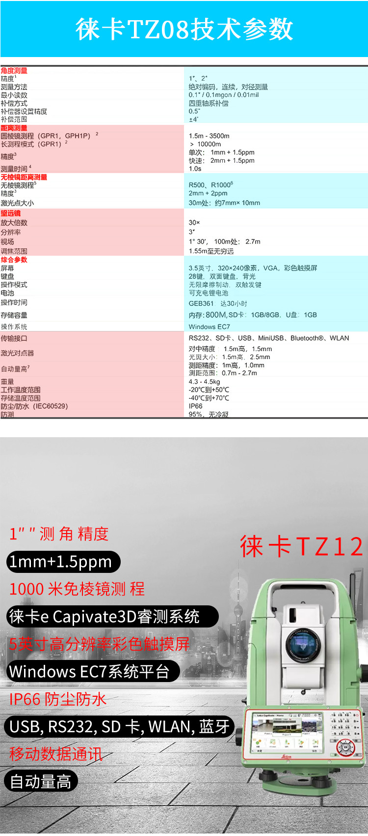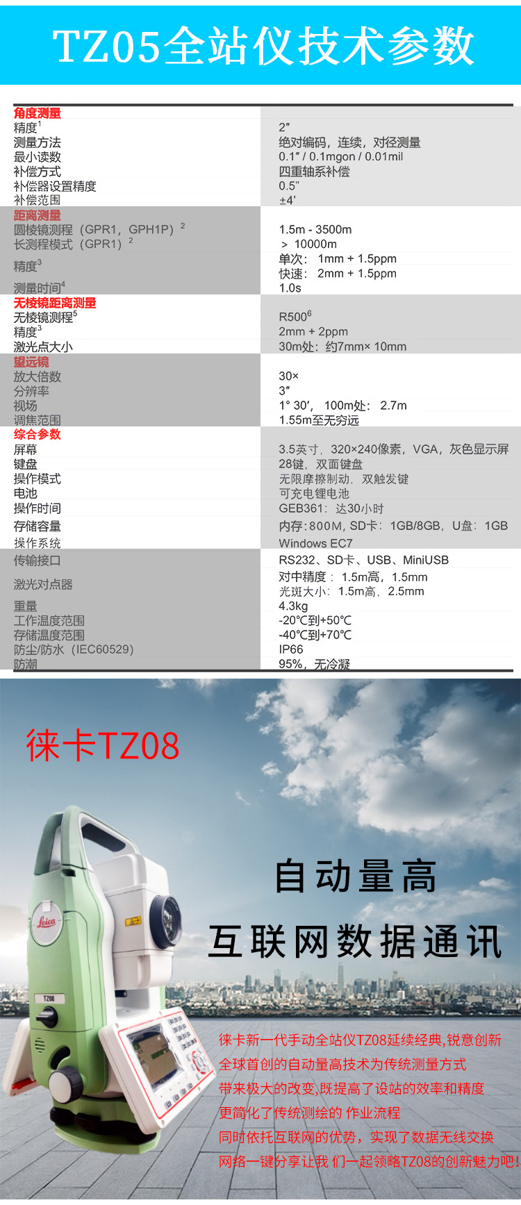 徠卡TZ08全站儀自動量高、互聯網數據通訊 徠卡新一代手動徠卡全站儀TZ08延續經典,銳意創新,自動量高技術為傳統測量方式帶來較大的改變,既提高了設站的效率和精度,更簡化了傳統測繪的作業流程。同...