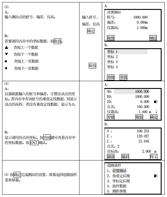 測(cè)站的設(shè)置可以通過(guò)鍵盤(pán)或從儀器內(nèi)存讀取的方式輸入。鍵盤(pán)輸入是按“樁號(hào)、偏差” 的形式輸入的,而從內(nèi)存中讀取的是 N、E、Z 坐標(biāo)形式。
